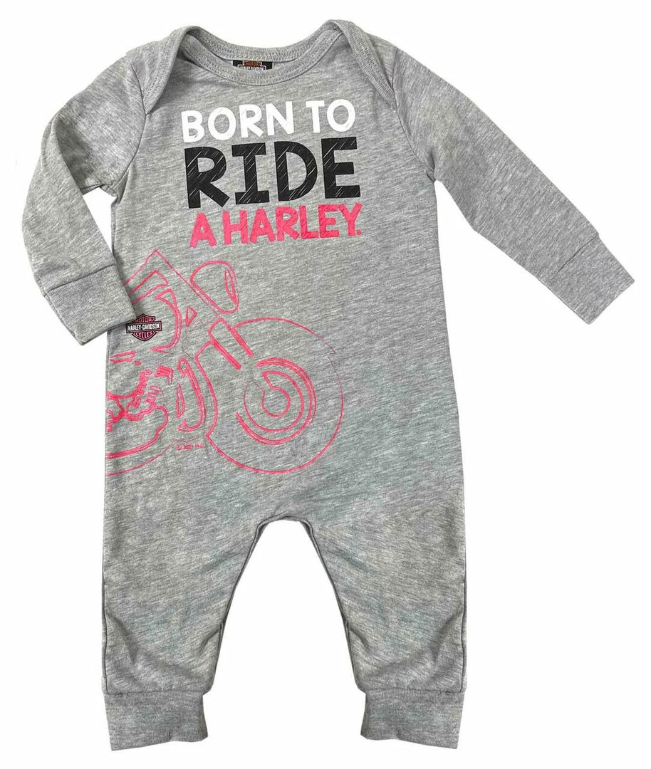 Harley-Davidson® Baby Girl’s Knit Newborn/Infant Coveralls – Light Gray, 3004117. Soft and comfortable, made from 90% cotton and 10% polyester. Long sleeve romper with an adorable hot pink motorcycle graphic. Bold ‘Born To Ride Harley®’ text screen printed on front. Five snap bottom closure. Rib-knit cuffs that will hold their shape wash after wash.
