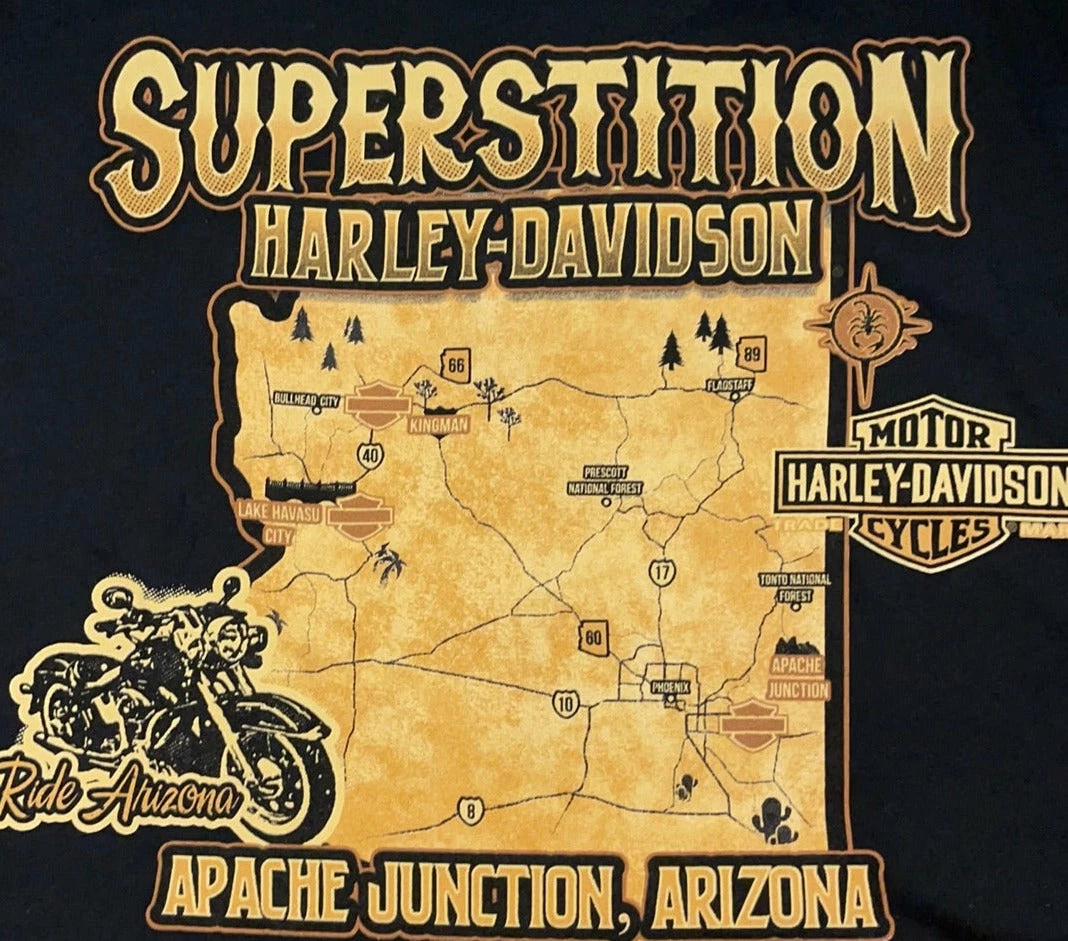 Decked out with a bar & shield logo on the front. Classic fit, crew-neck. Soft and lightweight shirt, made from 100% cotton. On the backside features Superstition Harley-Davidson custom Map print. Show your support by picking up this one today!