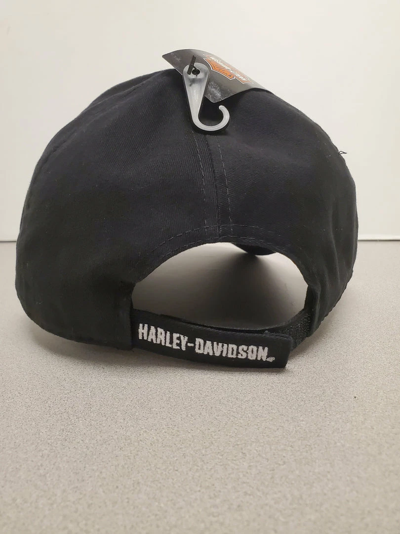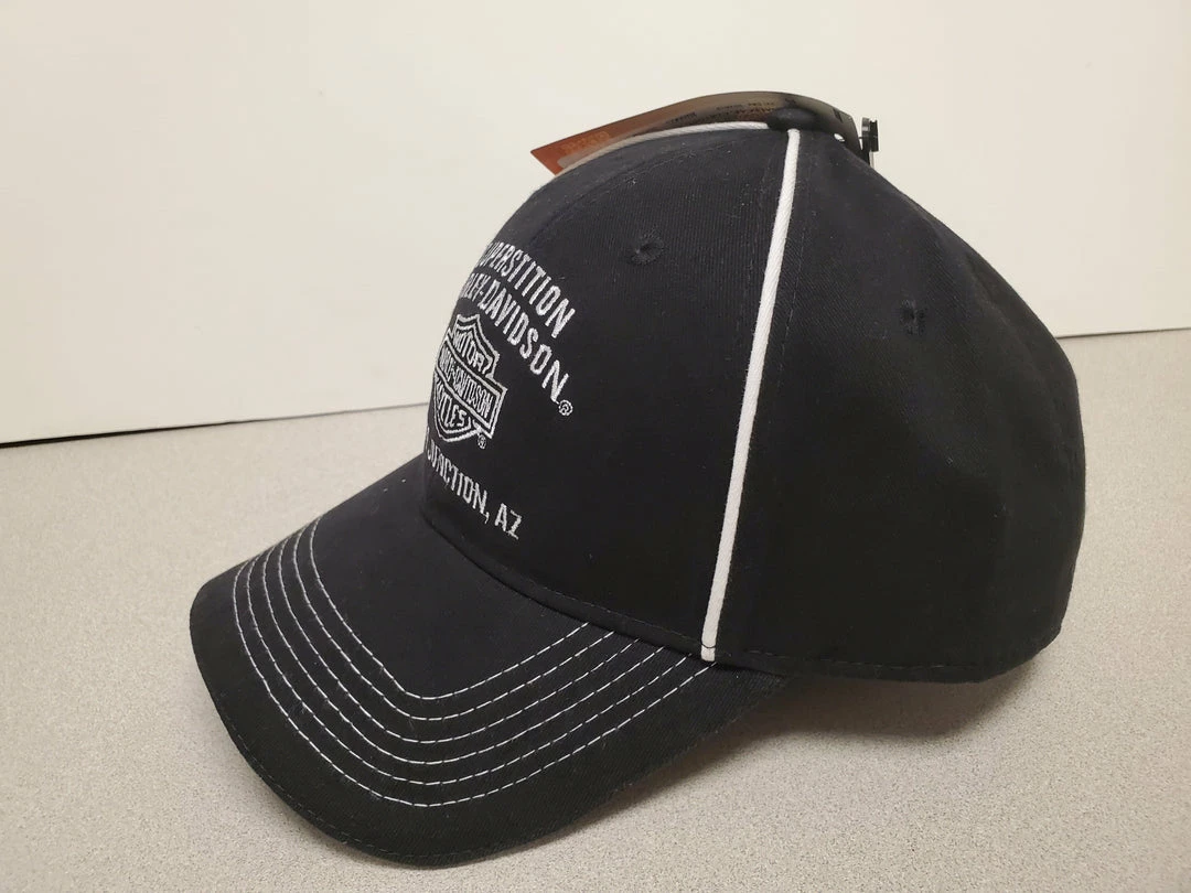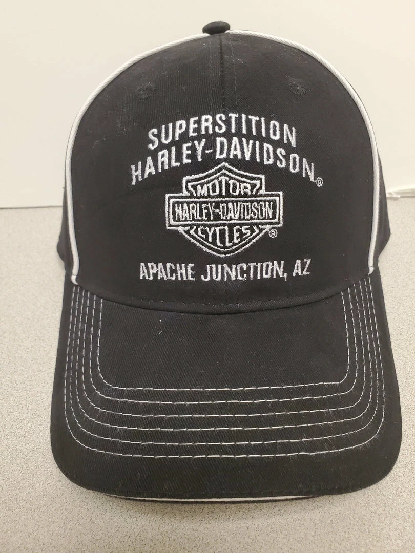 This hat is a simple, yet classic hat. Black baseball cap featuring Superstition Harley-Davidson embroidery on front face in white. Also highlights the famous Bar & Shield . The back side is a Velcro closure. Back features Harley-Davidson in white embroidery. Made from 100% Cotton.