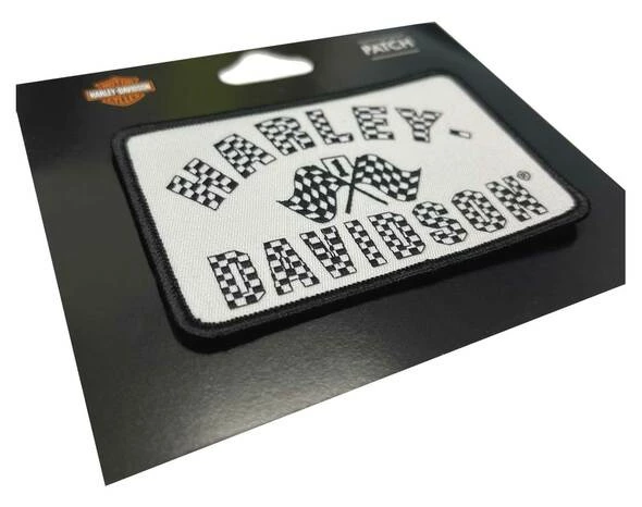 - Racing inspired H-D script and checkered flags graphic woven on patch