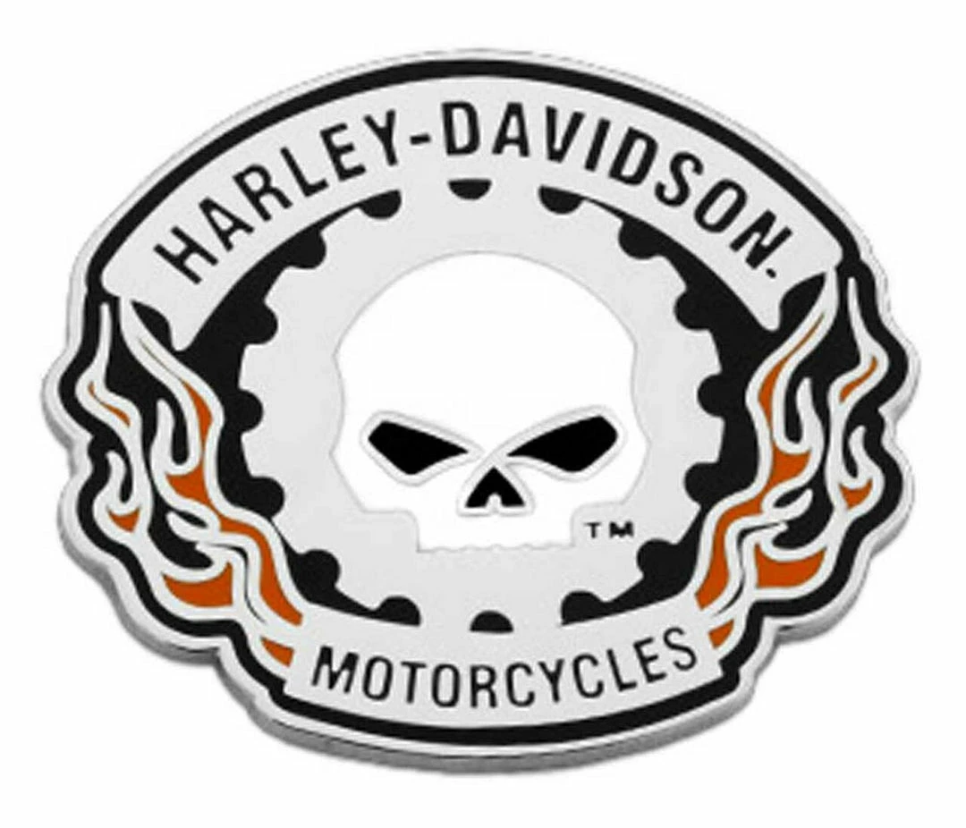 Iconic Willie G Skull logo surrounded by a sprocket and flames design and paired with engraved H-D® text. Made of high-quality metal. Silver finish with black, orange and white enamel fill. Heavy relief two flat head pin backs. Great gift for a friend or even yourself!