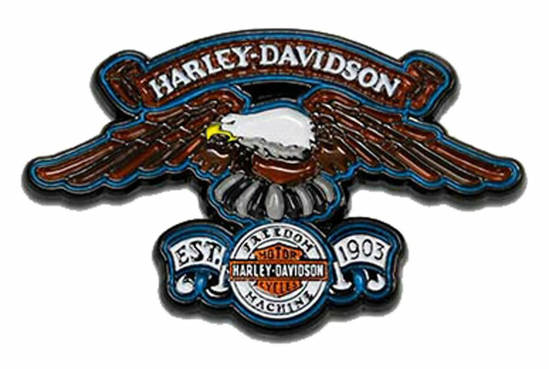 Awesome eagle graphic paired with iconic H-D® text and a Bar & Shield logo. Made of high-quality metal with a black finish and multi-colored enamel fill. Heavy relief two flat head pin backs. Great gift for a friend or even yourself!