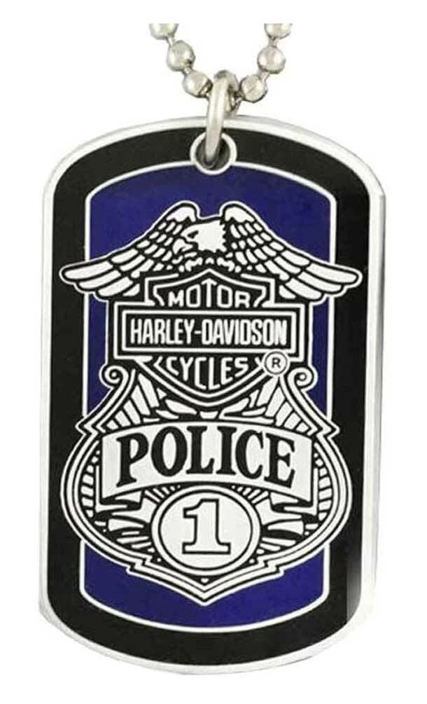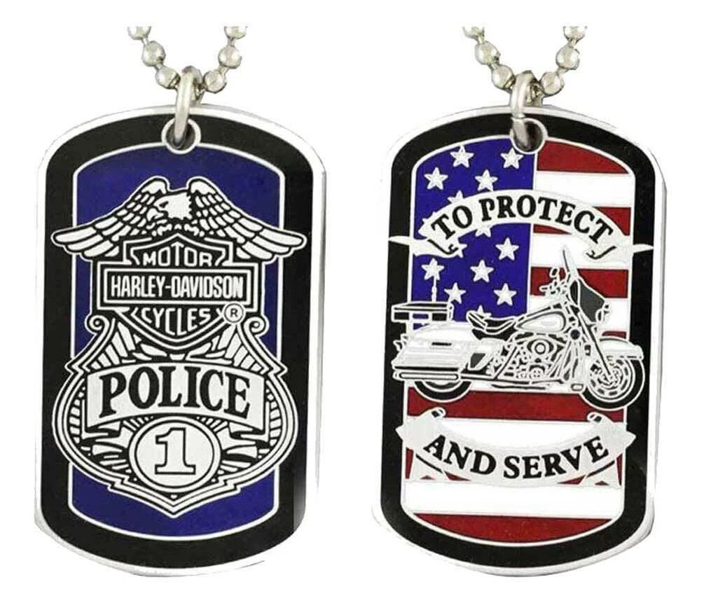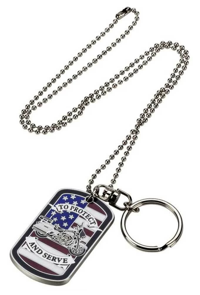 Can be either a necklace or a key chain. Necklace chain in 11” long. Front of dog tag features Police Bar & Shield badge. Back features Motorcycle American Flag graphic. Size of dog tag is 2” x 1”. Made of solid, heavy-duty metal.