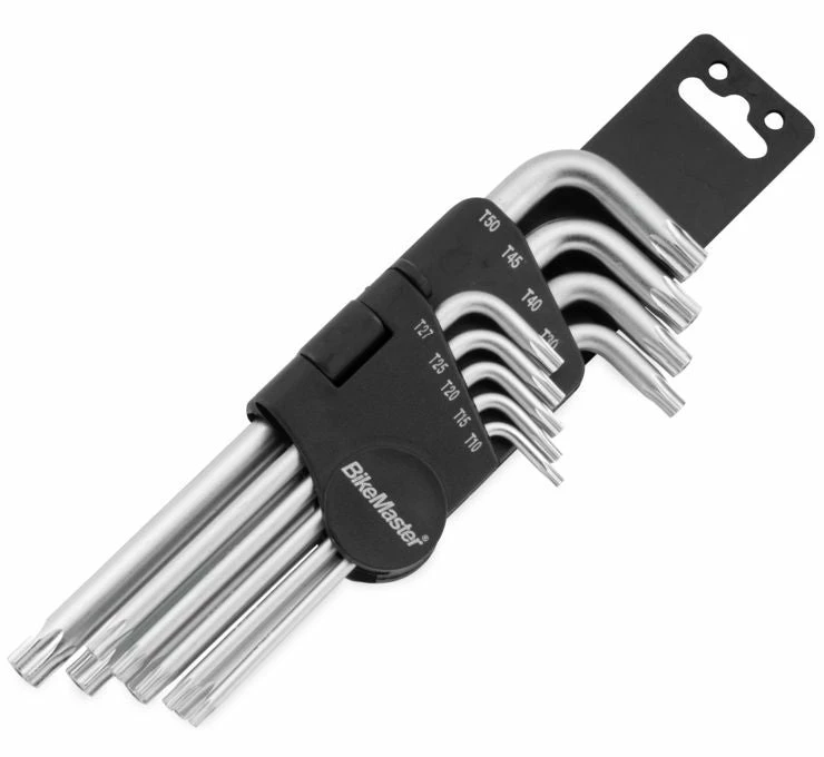 Made from precision-drawn, chrome-vanadium steel and comes with a manufacturer’s lifetime warranty. It features a security hole in the center and the wrenches have a corrosion-resistant coating in addition to a bead-blasted surface for better grip. The L-Torx set has extra-long reach that allows access to obscured bolts and more torque, while the S-Torx set is a short version that allows access to tight space. Both sets include a durable holder.