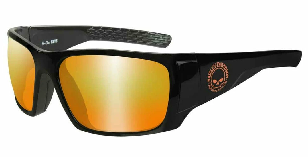 Part of the Asphalt Series. Orange mirror amber lenses with gloss black frames. Features a printed Willie G Skull logo on both temples. Eyewear meets ANSI Z87 high velocity impact and high mass impact requirements. This means they are able to withstand 20 .25 caliber steel projectiles fired at 150 FPS and a 1.1 lb. projectile dropped from 50″. Fits head sizes small and medium. Orange Mirror (Amber Base): Brightens environment in low-light conditions. Enhances contrast and depth perception. Perfect for overcast, hazy and foggy conditions. Light transmission: 16% +/- 3%. Includes: soft draw-string pouch, that doubles as a cleaning cloth. Size: 57-12-120.