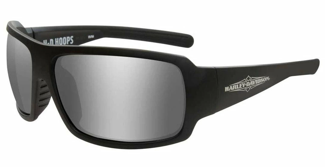 Part of the Asphalt Series. Gray silver flash lenses with matte black frames. Features a super cute Harley-Davidson® script graphic on both temples. Includes: soft draw-string pouch, that doubles as a cleaning cloth. Eyewear meets ANSI Z87 high velocity impact and high mass impact requirements. Fits head sizes medium and large. Silver flash lenses provide maximum shade. Excellent for riding in bright/glare conditions. Size: 63-12-120.