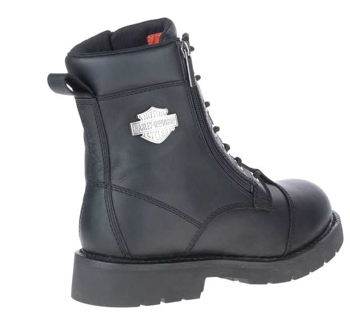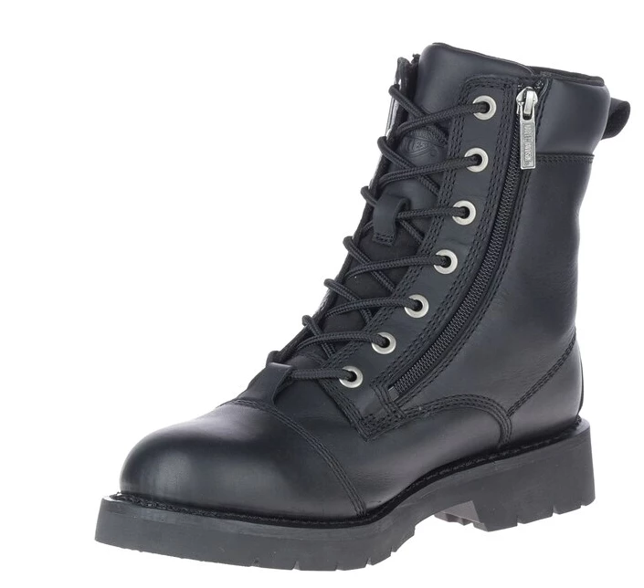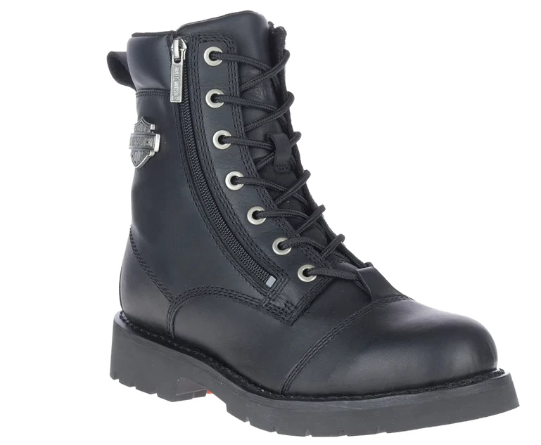 These boots exude a certain combat spirit for Harley® riders. Designed with a smooth rounded toe, the vamp gives way to seven metal eyelets for conventional lacing. However, the donning process is accelerated with dual YKK® locking zippers with logo tabs, as well as a pull-on loop on the shaft. Each zipper follows the contour of the eyelets for a symmetrically finished look. A metal Bar& Shield® logo is on the shaft. A debossed Bar & Shield® logo is also pressed onto the padded tongue. The boot’s cuff is also padded for extra hours of total comfort on the bike or while walking around. Made of full-grain leather and a full-length mesh lining, these boots will be a staple in your wardrobe for years to come. The boot’s sole, insole and upper are bound using resoleable Goodyear® Welt construction processes, the most labor intensive and durable construction method available. The rubber outsoles have Harley® orange tread elements, and a Harley-Davidson® orange logo is embedded at the instep. With a shaft height of 6.75-inches, you’ll experience just the right feel and support wanted for riding. The outsoles are rated BEST for slip and oil resistance