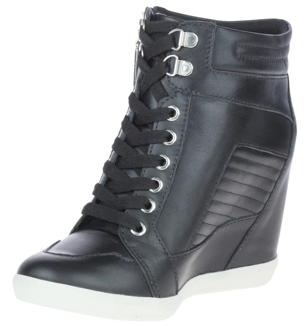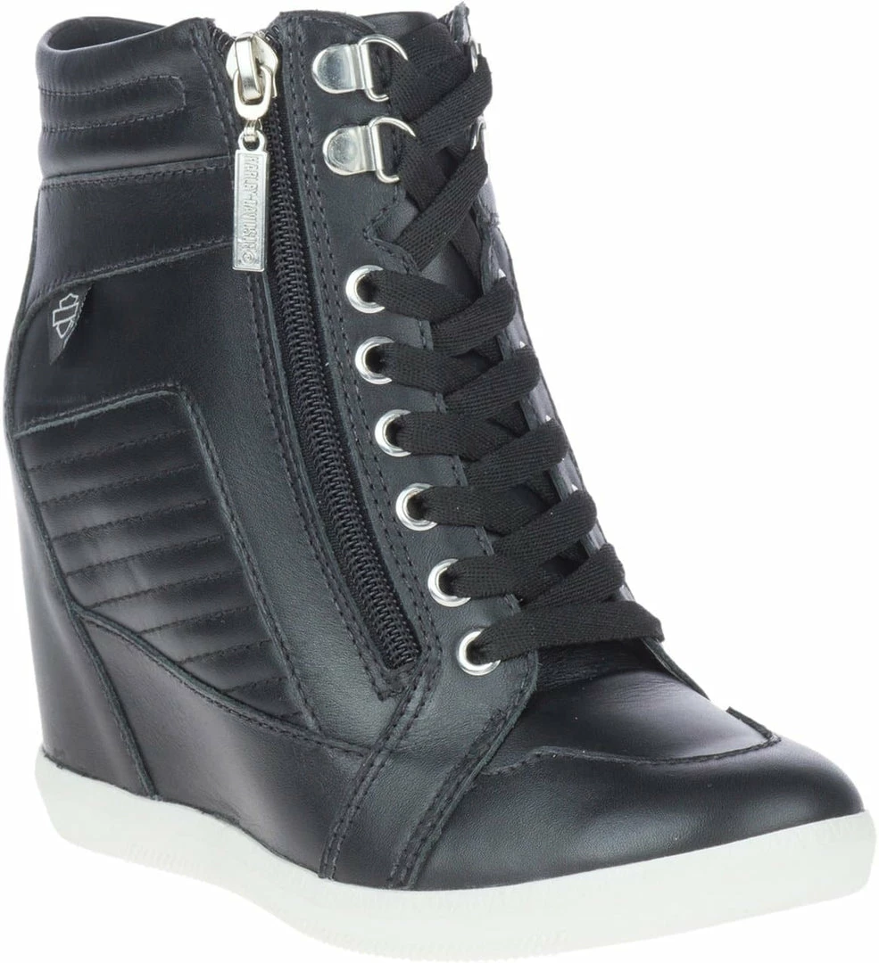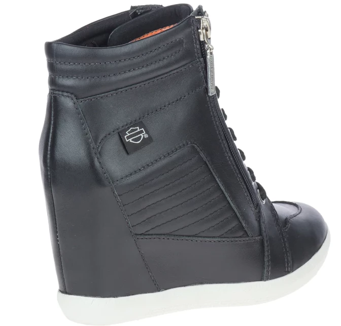 With 3.25-Inch hidden wedge lift, coupled with a 3.25-shaft, these boots reach a full 6.5-inches from the ground to the top of the cuff. Uniquely styled and all leather, these boots make a contemporary H-D® fashion statement. Wear with rolled-up jeans for an elongated look. Six metal lace eyelets and two D-Rings with a final outside zipper assist means you’ll be on your way in quick order. A Bar & Shield® silhouette fabric badge is sewn onto the shaft and the zipper sports a logo pull tab. Extra padding has been added to the cuff for hours of comfortable wear. The uppers are made with full-grain leather and a full-length mesh lining provides just the right comfort. The street side rubber soles are finished in white, providing a beautiful contrast to the black leather uppers. The boot’s sole, insole and upper are bound using cement construction processes, a time honored and durable method that allows for a flexible and easy stride.